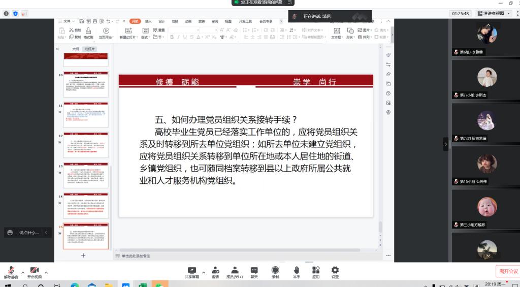 会议第二部分,邹超讲述了毕业生党员组织关系转接事宜,强调党组织关系的作用和重要性。接着将毕业生党员党组织转接情况分为已落实工作单位、未落实工作单位和专插本三种,详细解说了各类党员组织关系的转接方式、流程以及相关事宜,并针对个别情况的填写做了具体的要求。